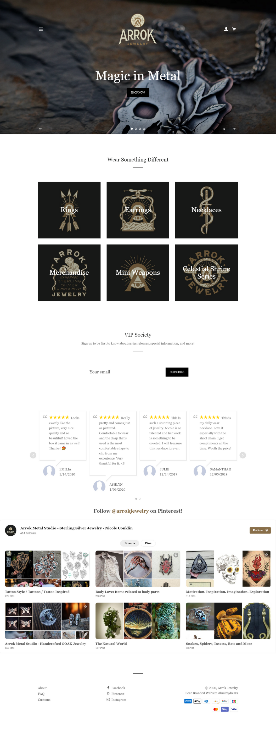 This customized Shopify website incorporates all of her awesome logo and submark designs, while also utilizing an easily shop-able layout. Not only does her site display her products it also captures emails for her VIP list, displays reviews, and has a really cool Pinterest app that links her Pinterest boards! She’s also got an app that allows her to extensively customize the form that her clients use to request custom jewelry pieces. This site is highly functional and Nicole was thrilled to make the leap off of Etsy!